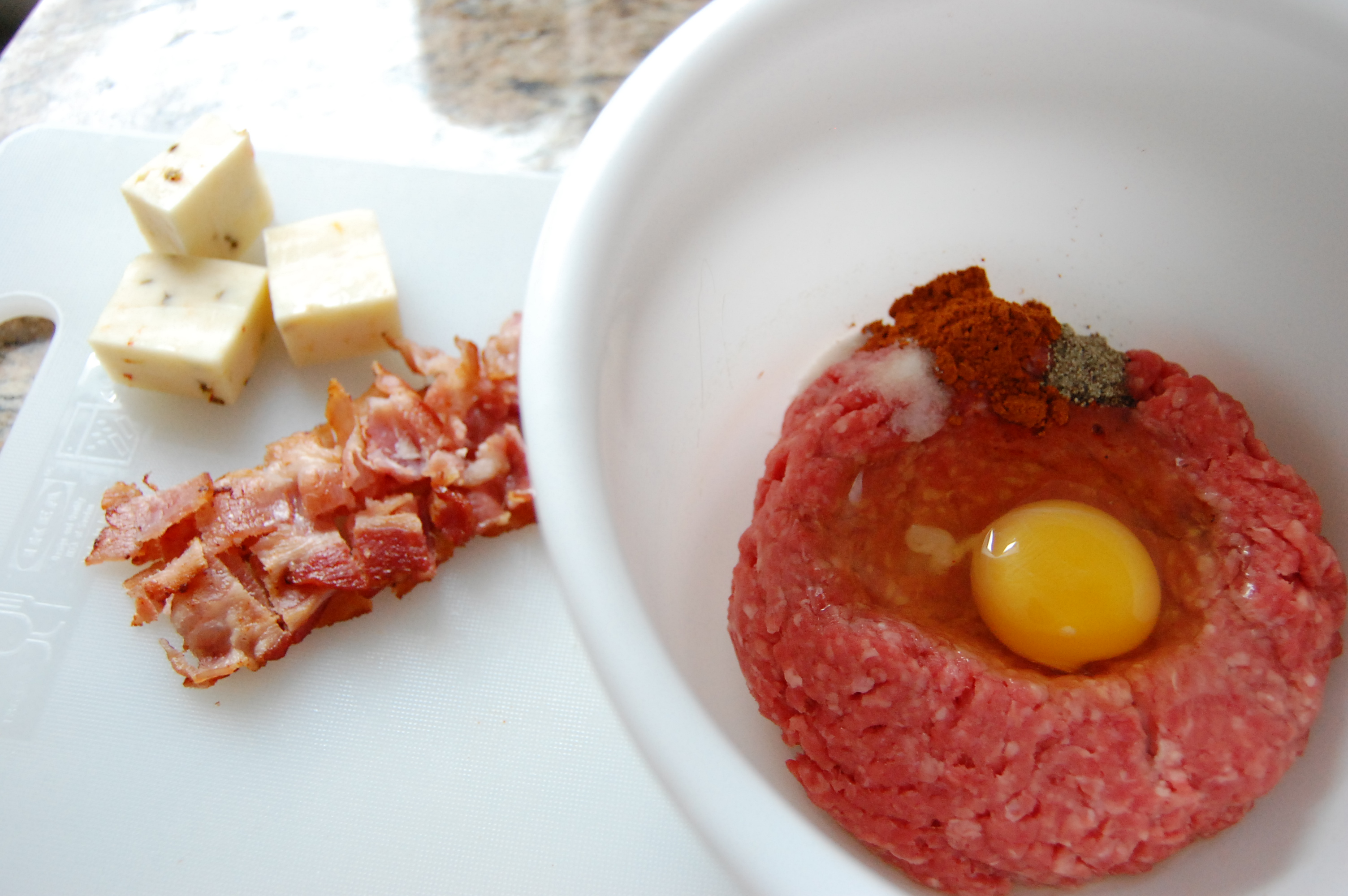 1. In large bowl, add ground beef, egg, chopped bacon, salt, pepper, paprika, and garlic powder. Mix with hands until blended, but take care not to “over handle” the contents or the burgers will be too dense. Form 4 patties.