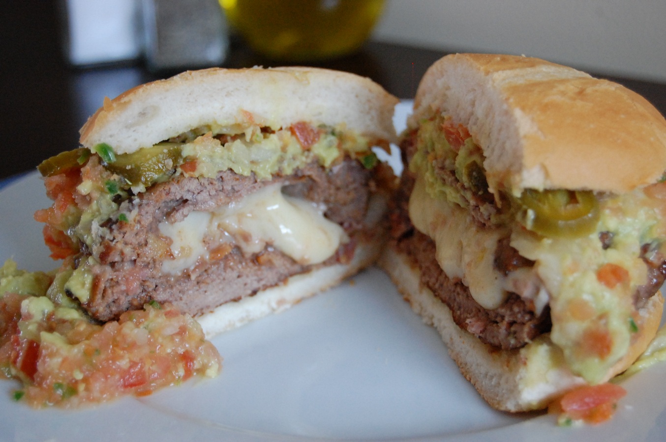 I don’t add breadcrumbs to my burgers. Sue me. Fit the cheese into a divot in the bottom half of what will be a half-pound patty. I happened to have pepper jack in the cheese drawer, so I used that and decided to top it all with guacamole, salsa, and pickled jalapeños. You, of course, can use whatever cheese and toppings you like best on your burger!