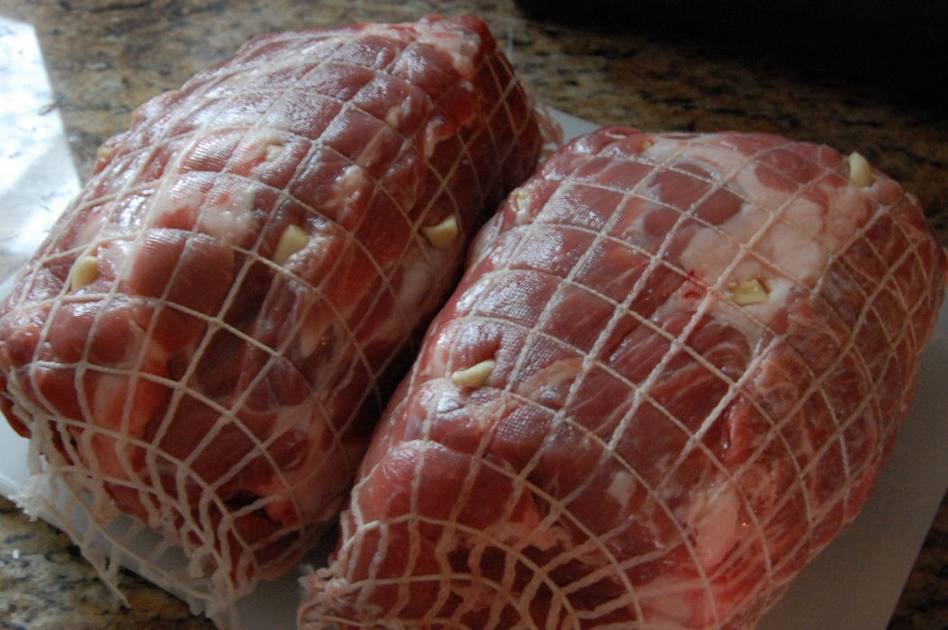 Pictured up there are two pork roasts – shoulder cut in this case. Beautiful, aren’t they? They are more photogenic than some people I know. Kidding! Stuck into the roasts are cloves are garlic instead of cloves, a substitution which I consider to be a stroke of genius. Anyway, get them in there by making slits with a sharp steak knife and then sliding the cloves into the holes you create.