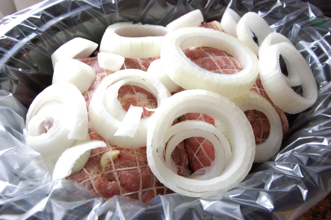 Let’s see how ridiculous I can make the next sentence. Line your slow cooker with a slow cooker liner and then line your slow cooker liner with onions. Well, that’s not as bad as I thought it would be.